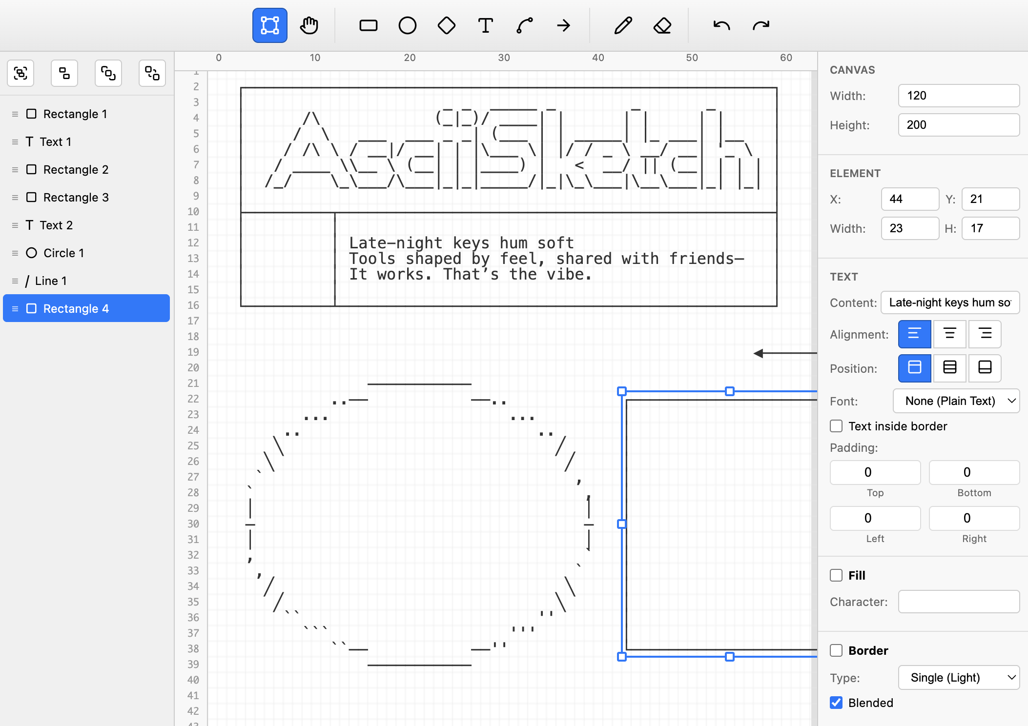 AsciiSketch lets you visually design diagrams, layouts, and technical illustrations using only text characters, while still working in a modern, visual editor right in your web browser.
